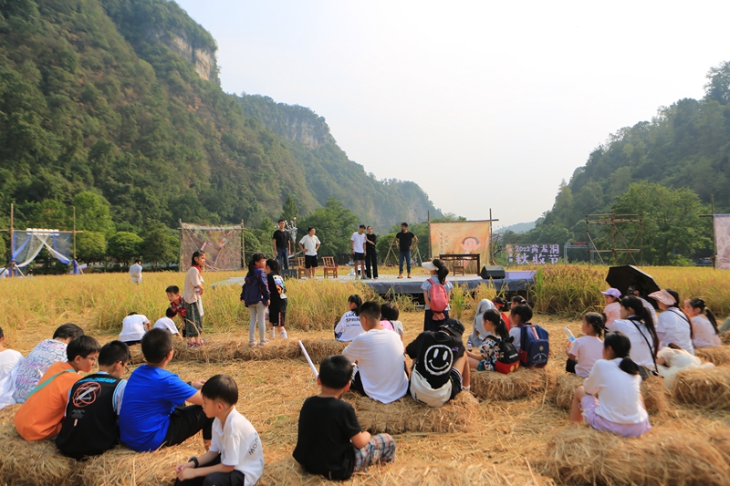 除了稻谷收割勞作體驗(yàn)、勞動(dòng)實(shí)踐這一常規(guī)保留項(xiàng)目外,第三屆黃龍洞秋收節(jié)還舉辦了包括稻作研學(xué)、稻田集市、田園音樂會(huì)、非遺文化體驗(yàn)、戲劇藝術(shù)展演等豐富多彩的活動(dòng)。在為期五天時(shí)間里,吸引了三萬多客人從四面八方趕赴過來。大家歡聚在黃龍洞外山谷的金色田野里,一起體驗(yàn)勞動(dòng)的快樂,感受豐收的喜悅,樂享戶外親子休閑生活。
